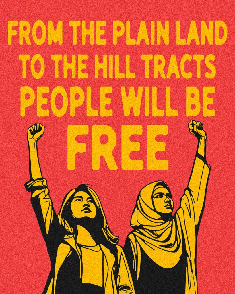 Sun wrote an op-ed shortly after the movement on public memory, chika mara, and the erasure of Indigenous voices after the uprising. A part of the students’ dofas (demands) was the demilitarization of the southeastern Chittagong Hill Tracts, where the military and industry have long encroached on indigenous groups such as the Chakma and Marma through tourism, land grabs, and resource extraction. For Sun, the rejection of certain dialects seen as “uncouth” or too foreign reflected the ways Indigenous people were denied their own voice in the outpouring of liberatory political expression. Hasina’s government had long repressed Indigenous film, art, and activism, reflecting an erasure of Indigenous representation that has existed in the constitution since the nation’s founding in 1971.
